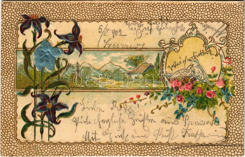 1902 Flowers, pigeons, art postcard. Emb. litho decorated with silk flowers<a href="https://www.darabanth.com/hu/gyorsarveres/438/kategoriak~Kepeslapok/Muveszlapok~2500077/1902-Flowers-pigeons-art-postcard-Emb-litho-decorated-with-silk-flowers~II286