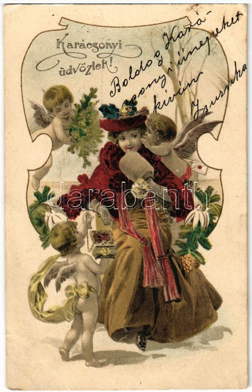 1902 Karácsonyi üdvözlet / Christmas greeting, lady with angels litho<a href="https://www.darabanth.com/hu/gyorsarveres/438/kategoriak~Kepeslapok/Udvozlolapok-Unnepek~2500089/1902-Karacsonyi-udvozlet-Christmas-greeting-lady-with-angels-litho~II28631
