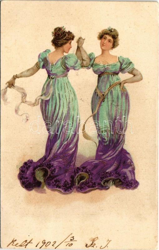 1902 Szecessziós iker hölgyek / Art Nouveau twin ladies. litho (EK)