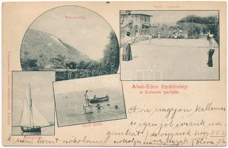 1903 Alsóörs, Malomvölgy, Bérvitorlás, Nyílt fürdő, Nyilvános lapdatér (tenisz). Divald (EK)<a href="https://www.darabanth.com/hu/gyorsarveres/414/kategoriak~Kepeslapok/Magyarorszag~1500003/1903-Alsoors-Malomvolgy-Bervitorlas-Nyilt-furdo-Nyilvanos-l