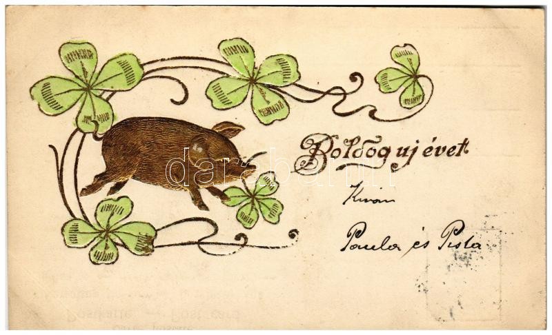 1903 Boldog Újévet! / New Year greeting art postcard with golden pig and clovers. Emb. litho<a href="https://www.darabanth.com/hu/gyorsarveres/416/kategoriak~Kepeslapok/Udvozlolapok-Unnepek~2000076/1903-Boldog-Ujevet-New-Year-greeting-art-postcard-w
