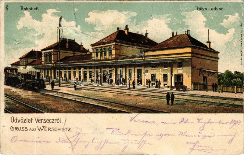 1903 Versec, Werschetz, Vrsac; vasútállomás, gőzmozdony, vonat / Bahnhof / railway station, locomotive, train. Wilih. Wettl. litho (b)
