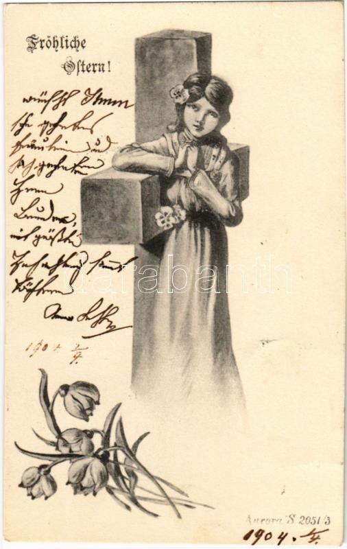 1904 Fröhliche Ostern! / Easter greeting card with girl and cross. Aurora S. 2051/3.<a href="https://www.darabanth.com/hu/gyorsarveres/417/kategoriak~Kepeslapok/Udvozlolapok-Unnepek~1500070/1904-Frohliche-Ostern-Easter-greeting-card-with-girl-and-cr
