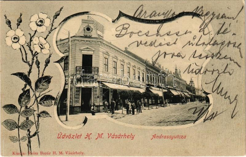 1904 Hódmezővásárhely, Andrássy utca, üzletek. Reisz Bazár kiadása, Art Nouveau, floral<a href="https://www.darabanth.com/hu/nagyaukcio/38/kategoriak~Kepeslapok/Magyarorszag~15644/1904-Hodmezovasarhely-Andrassy-utca-uzletek-Reisz-Bazar-kiadasa-Art-N