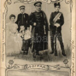 1904 I. Péter szerb király és családja. Szecessziós montázs Belgrád látképével / Peter I of Serbia and his family. Art Nouveau, floral montage with Belgrade (fa)
