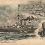 1904 Russo-Japanese War, Imperial Japanese Navy pre-dreadnought battleship ‘Mikasa’, flagship of Admiral Togo Heihachiro and Japanese torpedo boat destroyer ‘Shirakumo’; litho art postcard. s: Arensen (Rb)