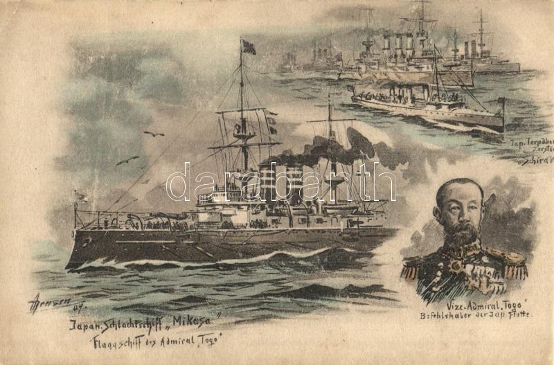 1904 Russo-Japanese War, Imperial Japanese Navy pre-dreadnought battleship ‘Mikasa’, flagship of Admiral Togo Heihachiro and Japanese torpedo boat destroyer ‘Shirakumo’; litho art postcard. s: Arensen (Rb)<a href="https://www.darabanth.com/hu/gyorsa
