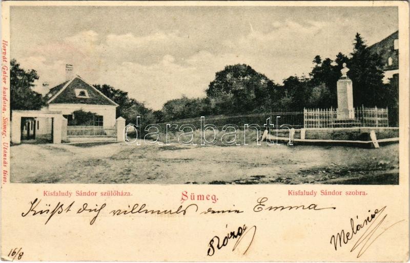 1904 Sümeg, Kisfaludy Sándor szülőháza és szobra. Horvát Gábor kiadása (EK)