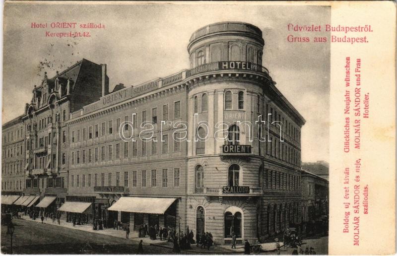 1905 Budapest VII. Hotel Orient szálloda, Rubin és Fürst üzlete. Kerepesi út 42. (Rákóczi út) – Boldog új évet kíván Molnár Sándor és neje szállodás (Rb)<a href="https://www.darabanth.com/hu/gyorsarveres/417/kategoriak~Kepeslapok/Magyarorszag~150000