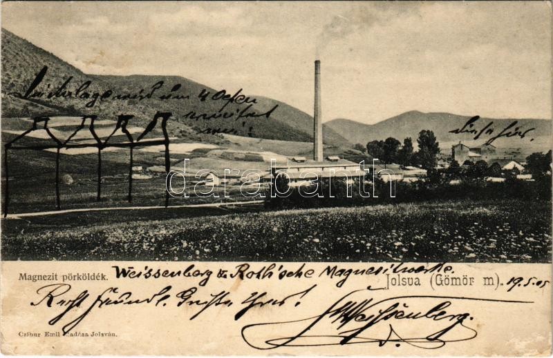 1905 Jolsva, Jelsava (Gömör); Magnezit pörköldék. Czibur Emil kiadása / magnesite factory, mine (felszíni sérülés / surface damage)