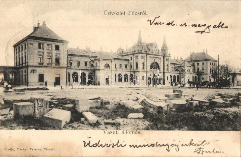 1905 Pécs, Vasútállomás, lovaskocsik, építési terület. Kiadja Fischer Ferenc (fl)