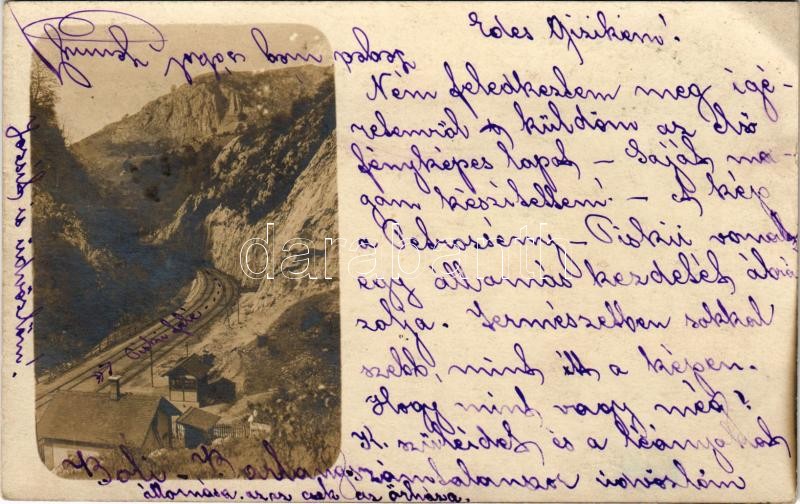 1905 Petrozsény, Petrosani; Vasúti részlet a Bóli barlang közelében, vasútvonal, Bolibarlang vasútállomás / Pestera Bolii / railway station near Bolia cave. photo (EK)<a href="https://www.darabanth.com/hu/nagyaukcio/38/kategoriak~Kepeslapok/Erdely~1
