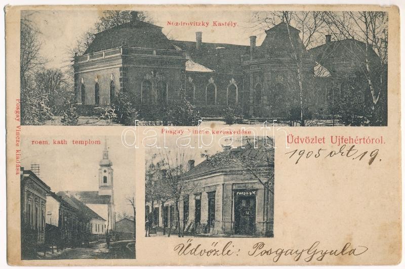 1905 Újfehértó, Nozdrovitzky kastély télen, Római katolikus templom, Posgay Vince üzlete és saját kiadása (EM)<a href="https://www.darabanth.com/hu/gyorsarveres/411/kategoriak~Kepeslapok/Magyarorszag~1000005/1905-Ujfeherto-Nozdrovitzky-kastely-telen