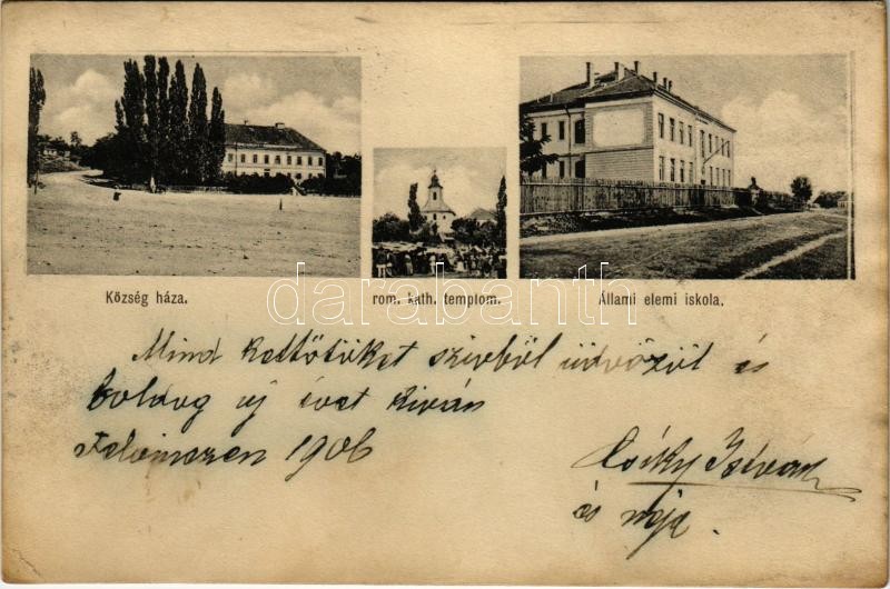 1906 Felvinc, Vintu de Sus, Unirea; Községháza, Római katolikus templom, Állami elemi iskola / town hall, Catholic church, school (r)