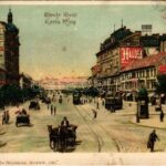 1907 Budapest V. Károly körút, villamosok, Haldek szőnyegház, Wellinger és Weiss, Strausz üzlete. Erdélyi cs. és kir. udvari fényképész felvételei után. litho (fa)