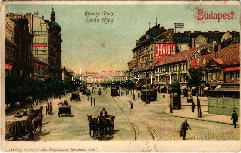 1907 Budapest V. Károly körút, villamosok, Haldek szőnyegház, Wellinger és Weiss, Strausz üzlete. Erdélyi cs. és kir. udvari fényképész felvételei után. litho (fa)<a href="https://www.darabanth.com/hu/gyorsarveres/415/kategoriak~Kepeslapok/Magyarors