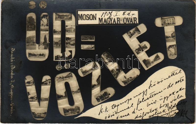 1908 Magyaróvár, Mosonmagyaróvár; mozaiklap. Buda János kiadása (fl)<a href="https://www.darabanth.com/hu/gyorsarveres/417/kategoriak~Kepeslapok/Magyarorszag~1500004/1908-Magyarovar-Mosonmagyarovar-mozaiklap-Buda-Janos-kiadasa-fl~II2627809/?utm_sour