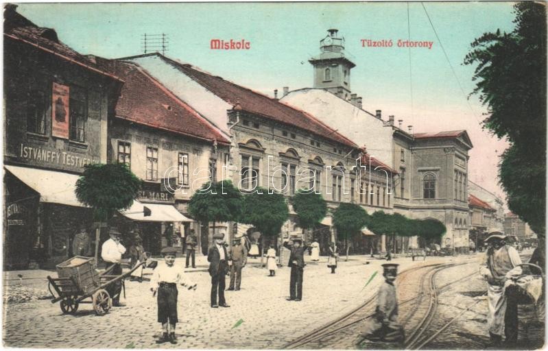 1908 Miskolc, Tűzoltó őrtorony, Istvánffy Testvérek üzlete, villamossín