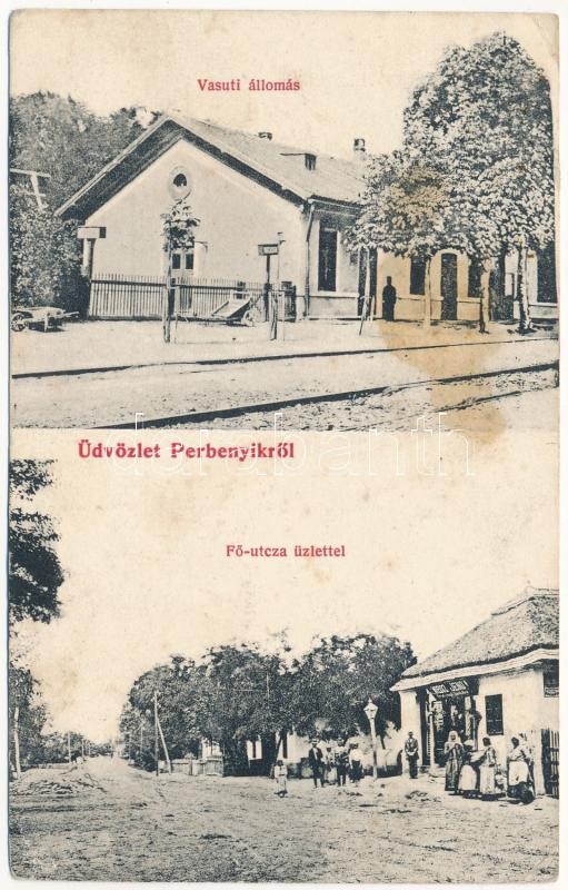 1908 Perbenyik, Pribenik (Királyhelmec mellett); vasútállomás, Fő utca, Weisz Jenő üzlete és nála kapható / railway station, shop, main street (EK)