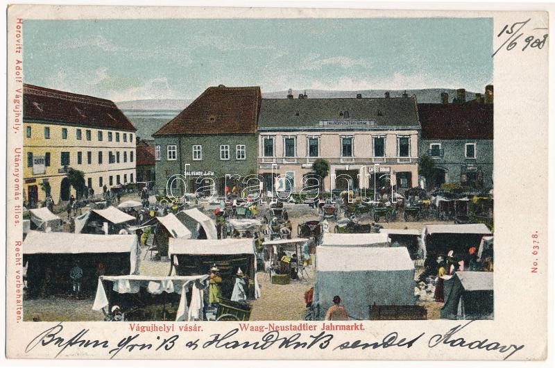 1908 Vágújhely, Waag-Neustadt, Nové Mesto nad Váhom; vásár, piac, Takarékpénztár, Salvendy J. és fia üzlete, Birman kávéház. Horovitz Adolf kiadása / market, shops, savings bank, cafe (EK)<a href="https://www.darabanth.com/hu/nagyaukcio/38/kategoria