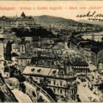 1909 Budapest I. Kilátás a Gellérthegyről, Tabán, piac, vár, Döbrentei tér, Stósz-féle vendéglő, Rácz fürdő, fodrász. Taussig A. 10648.<a href="https://www.darabanth.com/hu/nagyaukcio/38/kategoriak~Kepeslapok/Magyarorszag~15644/1909-Budapest-I-Kilat