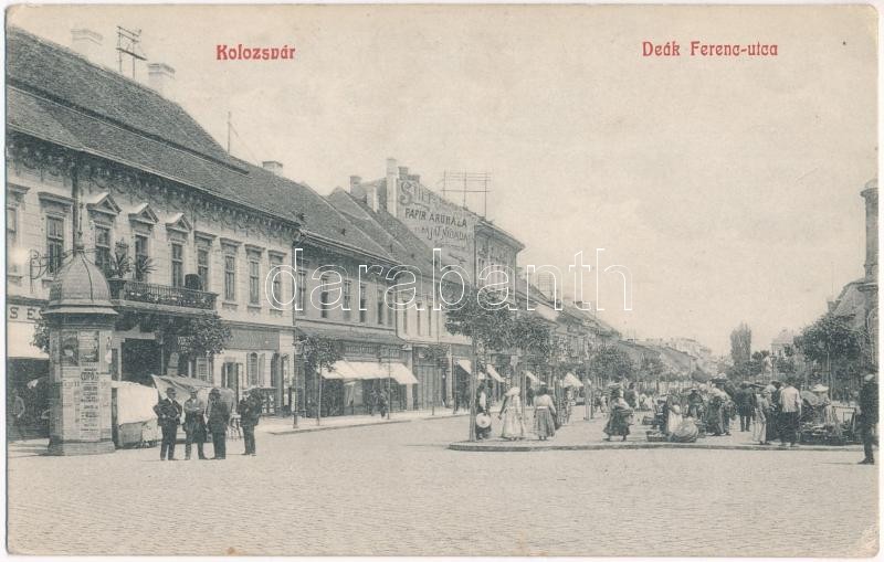 1909 Kolozsvár, Cluj; Deák Ferenc utca, piac, hirdetőoszlop, Sárga Kristóf és Klenk Emília üzlete, Stief papíráruháza és saját nyomdája / square, market, shops (EK)<a href="https://www.darabanth.com/hu/gyorsarveres/415/kategoriak~Kepeslapok/Erdely~1
