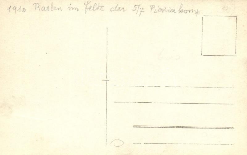 1910 Rasten im Felde der 5/7 Pionierkomp. / Osztrák-magyar katonák pihenője / K.u.K. soldiers resting in the field. photo<a href="https://www.darabanth.com/hu/gyorsarveres/412/kategoriak~Kepeslapok/Katonai~2000058/1910-Rasten-im-Felde-der-57-Pionier