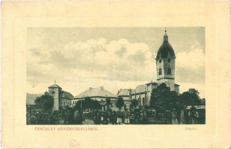 1911 Szinérváralja, Seini; Piactér, Római katolikus templom, utcai árusok. W. L. Bp. 2383. / marketplace, Catholic church, street vendors (ragasztónyom / glue marks)<a href="https://www.darabanth.com/hu/gyorsarveres/411/kategoriak~Kepeslapok/Erdely~