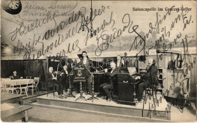 1911 Wien, Vienna, Bécs; Jos. Parzer’s Restaurant ‘Bürgertheater’ Hauptstraße 1a. Saloncapelle im Concert-Keller / restaurant, interior with music band. ‘Anitta’ Wien (EK)<a href="https://www.darabanth.com/hu/gyorsarveres/412/kategoriak~Kepeslapok/A