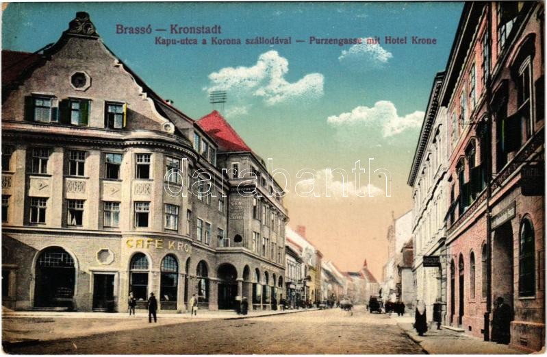 1912 Brassó, Kronstadt, Brasov; Kapu utca, Korona szálloda és kávéház, Seewaldt A. és Theil. üzlete / street, hotel and cafe, shops (EK)<a href="https://www.darabanth.com/hu/nagyaukcio/38/kategoriak~Kepeslapok/Erdely~15646/1912-Brasso-Kronstadt-Bras