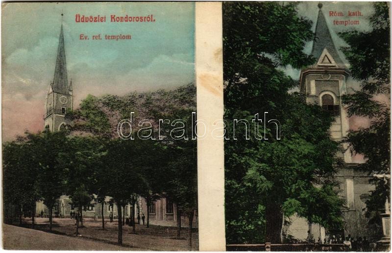 1912 Kondoros, Evangélikus templom, Római katolikus templom. Fogyasztási szövetkezet kiadása (fa)