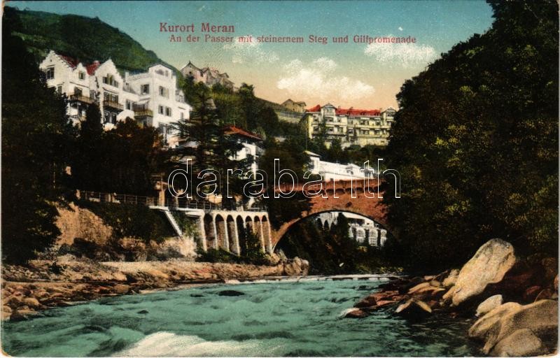 1912 Merano, Meran (Südtirol); An der Passer mit steinernem Steg und Gilfpromenade / stone bridge (EK)<a href="https://www.darabanth.com/hu/gyorsarveres/412/kategoriak~Kepeslapok/Olaszorszag~2000062/1912-Merano-Meran-Sudtirol-An-der-Passer-mit-stein