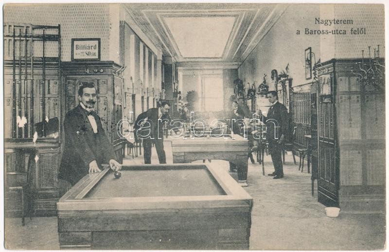 1913 Budapest VIII. Magyar Szalon Kávéháza, Nagyterem a Baross utca felől, belső biliárd asztalokkal, Tulajdonosok Jakobovics és fia. Üllői út 14 és Baross utca 11.<a href="https://www.darabanth.com/hu/nagyaukcio/38/kategoriak~Kepeslapok/Magyarorsza