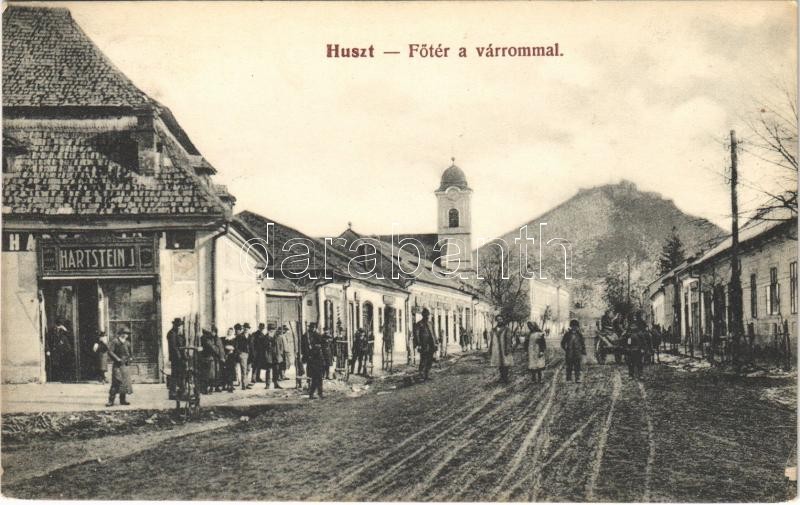 1913 Huszt, Chust, Khust; Fő tér és várrom, Hartstein J. üzlete / main square, castle ruins, shop