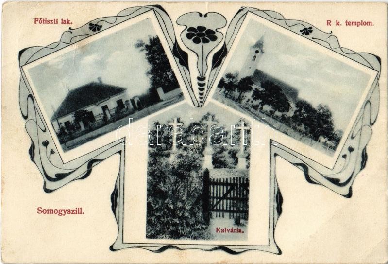 1913 Somogyszil, Főtiszti lak, Római katolikus templom, Kálvária. Art Nouveau, kiadja Bergl Simon és fia (EB)<a href="https://www.darabanth.com/hu/nagyaukcio/38/kategoriak~Kepeslapok/Magyarorszag~15644/1913-Somogyszil-Fotiszti-lak-Romai-katolikus-te