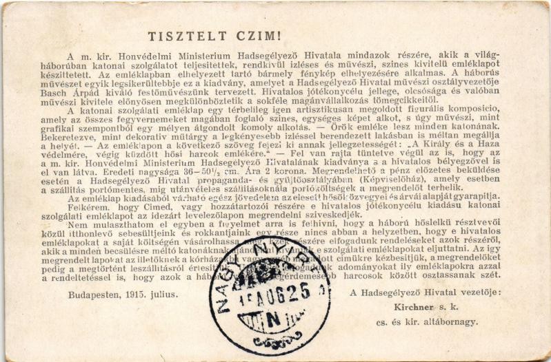 1914-1915 A király és a haza védelmére, végigküzdött hősi harcok emlékére. Szecessziós katonai propaganda művészlap Ferenc József és II. Vilmos arcképével. Hátoldalon Hadsegélyező Hivatal szövege / WWI Viribus Unitis military propaganda with Franz Joseph