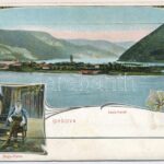 1914 Ada Kaleh, Török sziget Orsova alatt, Bego-Török. leporellolap: Huszni Szalih és Társa üzlete, bazár, Raim Mehmed kávéháza, stb. Szecessziós keret / Turkish island, Bego Mustafa. leporellocard with Raim Mehmed’s café, bazaar of