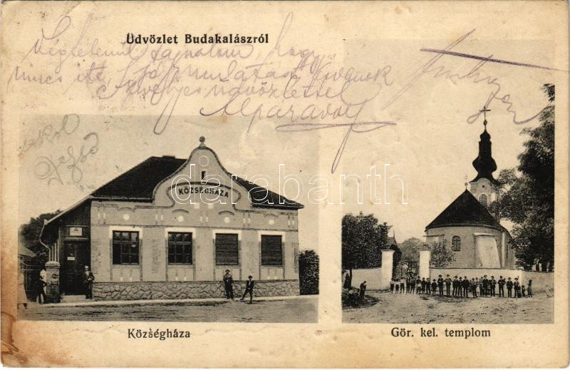 1914 Budakalász, Községháza, Görögkeleti (szerb ortodox) templom. Popper Sándor kiadása (EK)
