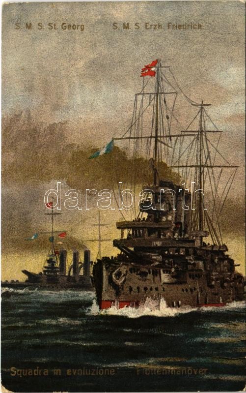 1914 Squadra in evoluzione / Az Osztrák-Magyar Haditengerészet SMS Sankt Georg páncélos cirkálója és az SMS Erzherzog Friedrich pre-dreadnought csatahajója / Flottenmanöver. K.u.K. Kriegsmarine Panzerkreuzer, Linienschiffe / WWI Austro-Hungarian Navy, SMS