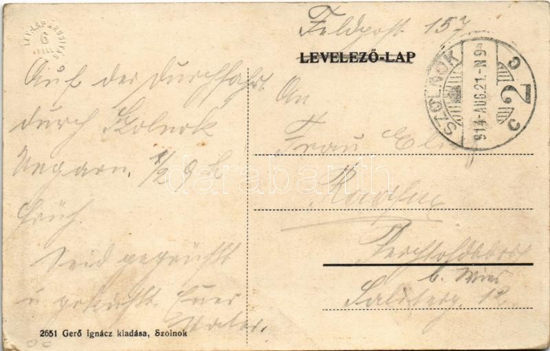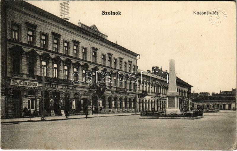 1914 Szolnok, Kossuth tér, tejcsarnok, Dr. Szegő fogorvos, Perlesz Lajos, Boros Béla és Lehoczky Mihály üzlete, Honvéd szobor, Külső Szolnok Megyei takarékpénztár. Gerő Ignác kiadása 2651. (EK)<a href="https://www.darabanth.com/hu/nagyaukcio/38/kate