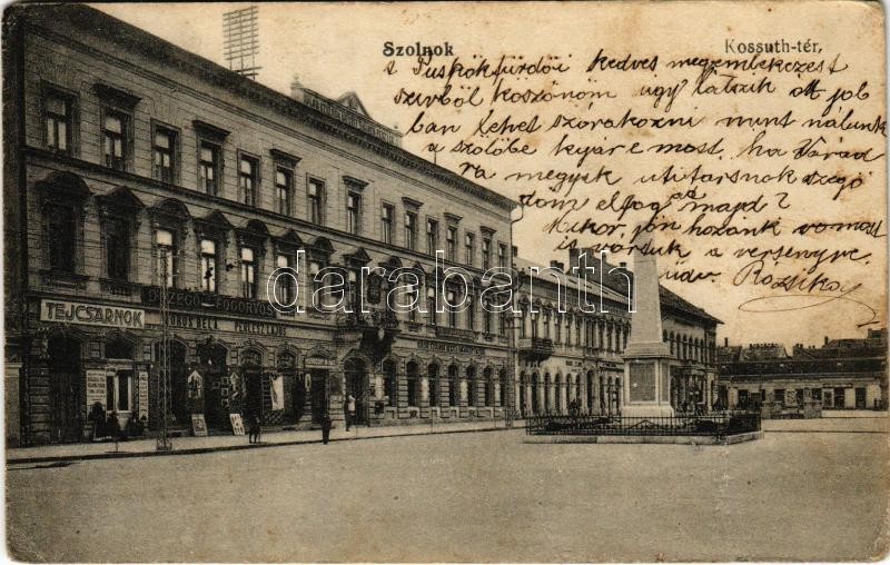 1914 Szolnok, Kossuth tér, tejcsarnok, Perlesz Lajos, Koros Béla üzlete, fogorvos, Külső Szolnok Megyei Takarékpénztár. Gerő Ignác kiadása (fa)