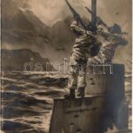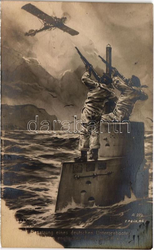 1915 Die Besatzung eines deutschen Unterseebootes wehrt einen englischen Fliegerangriff ab / WWI German Navy (Kaiserliche Marine) art postcard, the crew of a German submarine fends off the English air attack + ‘K.U.K. KRIEGSMARINE SMS PRINZ EUGEN’