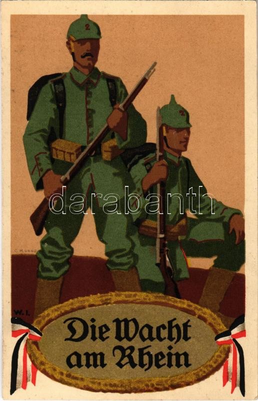 1915 Die Wacht am Rhein / WWI German military art postcard. G.M. 4442. litho s: W.I.<a href="https://www.darabanth.com/hu/gyorsarveres/415/kategoriak~Kepeslapok/Katonai~1000067/1915-Die-Wacht-am-Rhein-WWI-German-military-art-postcard-GM-4442-litho-s