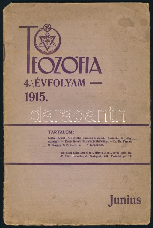 1915 Teozófia, a Magyar Teozófiai Társulat lapja 4. év. 1 és 6. sz., Szerk.: dr. Rózsaffy Dezső. Bp., Károlyi György kő- és könyvnyomdája, Szabadkőműves folyóirat<a href="https://www.darabanth.com/hu/gyorsarveres/424/kategoriak~Mutargy-papirregiseg-