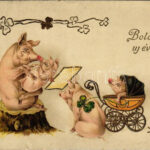 1916 Boldog új évet! Malac család / New Year greeting, pig family. Art Nouveau, floral, litho (fa)<a href="https://www.darabanth.com/hu/nagyaukcio/40/kategoriak~Kepeslapok/Udvozlolapok-Unnepek~16506/1916-Boldog-uj-evet-Malac-csalad-New-Year-greeting