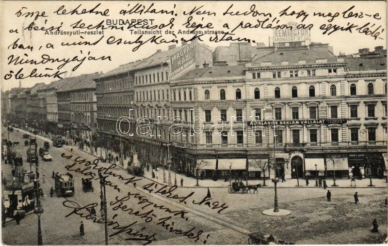 1916 Budapest VI. Andrássy úti részlet, villamos, Magyar Ház étterem, büfé, Általános Reklámvállalat, üzletek (EK)<a href="https://www.darabanth.com/hu/gyorsarveres/413/kategoriak~Kepeslapok/Magyarorszag~2000006/1916-Budapest-VI-Andrassy-uti-reszlet