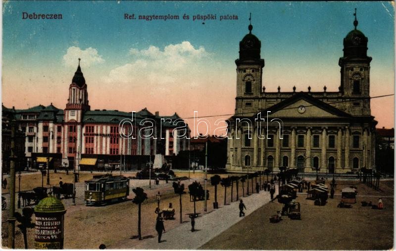 1916 Debrecen, Református nagytemplom és püspöki palota, villamos, piac, Első Magyar Általános Biztosító Társaság főügynöksége (EK)<a href="https://www.darabanth.com/hu/gyorsarveres/414/kategoriak~Kepeslapok/Magyarorszag~1500003/1916-Debrecen-Reform