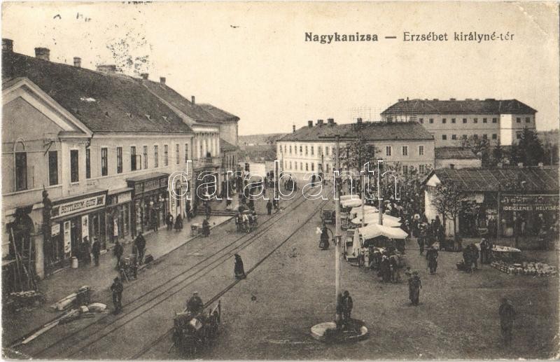 1916 Nagykanizsa, Erzsébet királyné tér, Bettlheim és Guth üzlete, piaci árusok, ideiglenes helyiség a divatáruknak. Hirschler-tőzsde kiadása (EK)<a href="https://www.darabanth.com/hu/gyorsarveres/415/kategoriak~Kepeslapok/Magyarorszag~1000005/1916-