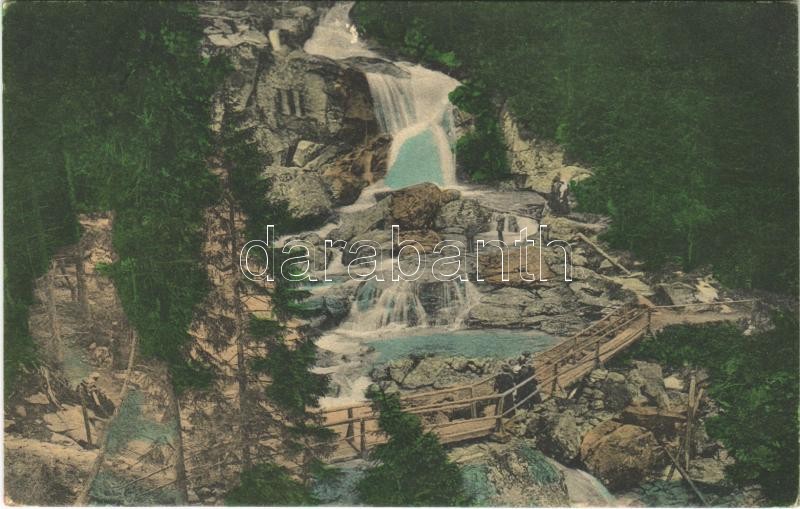 1917 Kárpátok, vízesés, fahíd kirándulókkal / Carpathian mountains, waterfall, wooden bridge with hikers