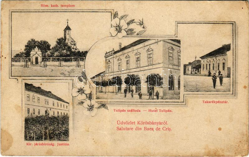 1917 Körösbánya, Kőrösbánya, Altenburg, Baia de Cris; Római katolikus templom, Takarékpénztár, Tulipán szálloda, Kir. Járásbíróság. Cotioiu Romulus kiadása / church, savings bank, hotel, court. Art Nouveau, floral (fa)<a href="https://www.darabanth.